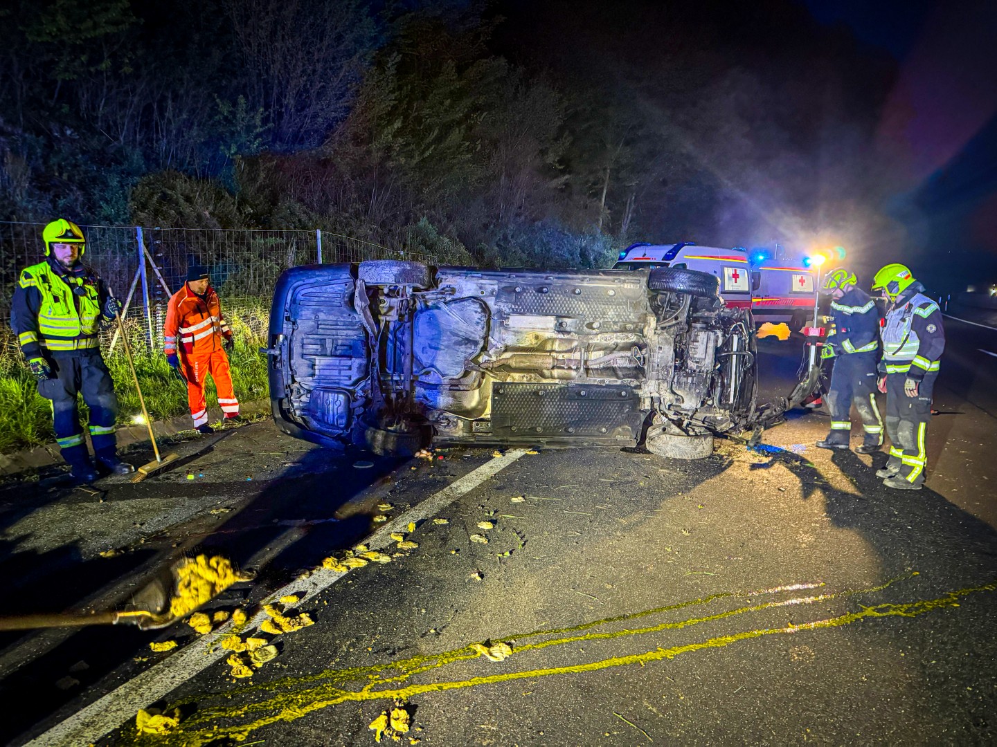 Alle vier Insassen konnten sich glücklicherweise noch vor dem Eintreffen der Einsatzkräfte selbst aus dem Fahrzeug befreien. Alle vier Personen mussten medizinisch vom Rettungsdienst und Feuerwehrsanitätern versorgt werden. Zwei Personen wurden im Anschluss mit Verletzungen unbestimmten Grades vom Roten Kreuz in ein Krankenhaus gebracht.